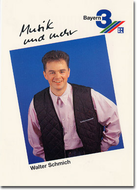 der von einem Ingolstädter Privatradio kam. Walter Schmich war Musikredakteur bei Bayern3 und als äußerst kompetenter Kenner der Rock-Geschichte einmal wöchentlich in "Nightlife" zu hören. 1997 wurde er Musikchef, 2001 zusätzlich stellvertretender Programmvertreter. Am 1. April 2003 wurde Schmich Nachfolger von Programmchef Klaus Bleicher, der am 1. Februar 2003 zum SWR wechselte. ![]() ![]() |